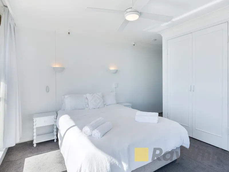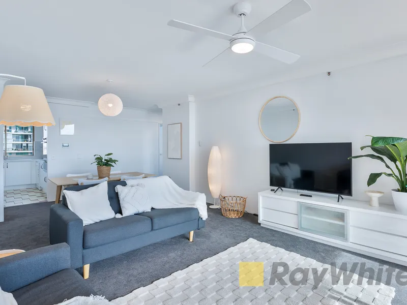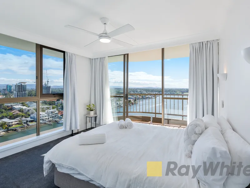 This premier riverfront residence offers resort-style living in the heart of Surfers Paradise. Positioned on a high floor, this beautifully renovated two-bedroom, two-bathroom apartment delivers exceptional panoramic views of the river, hinterland, city skyline, and ocean.