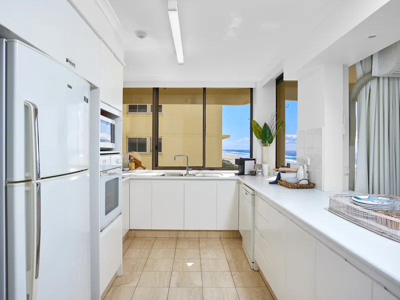 Positioned on the 4th floor and occupying half the level, this spacious residence offers a rare sense of privacy, space, and direct connection to the sand and surf. Bathed in natural light and cooled by refreshing sea breezes, the apartment showcases breathtaking ocean views stretching both up and down the coastline.