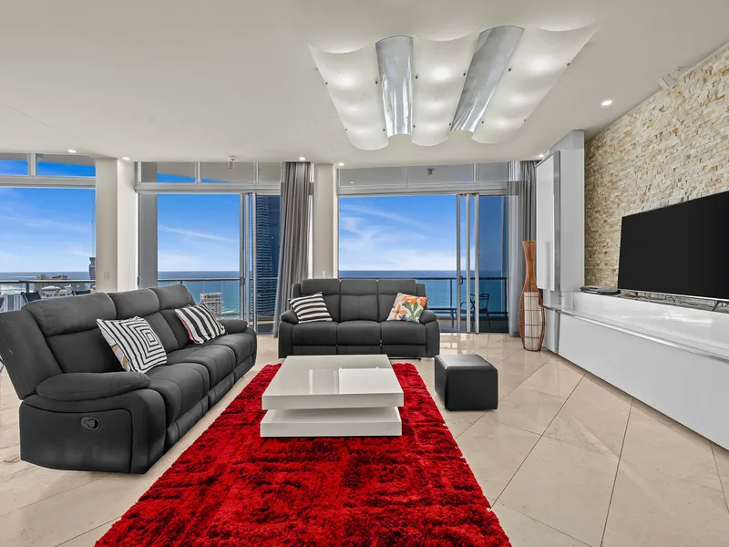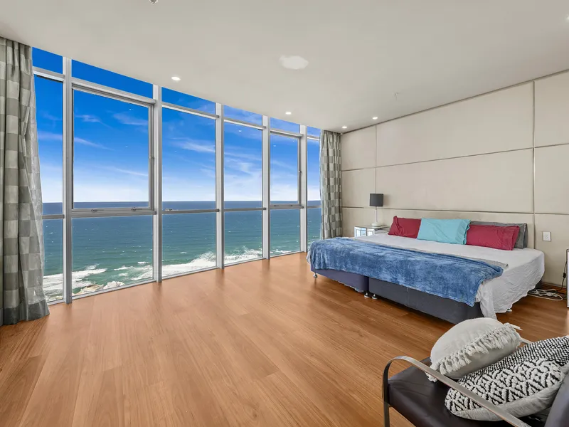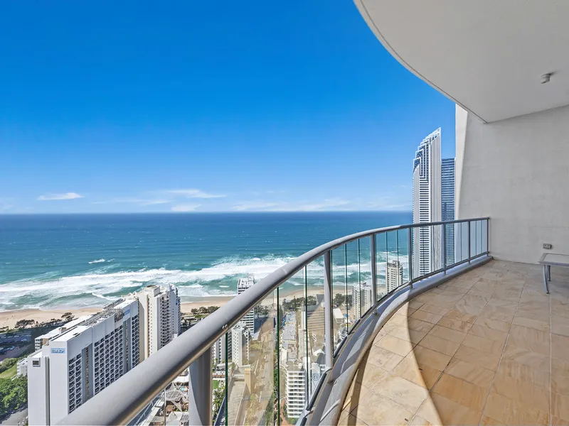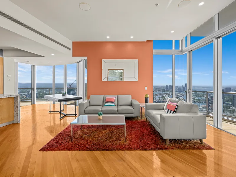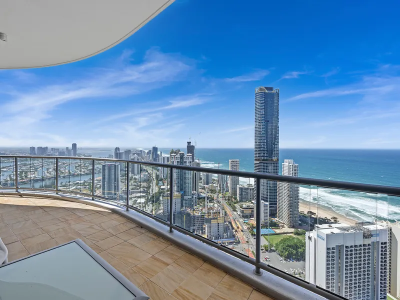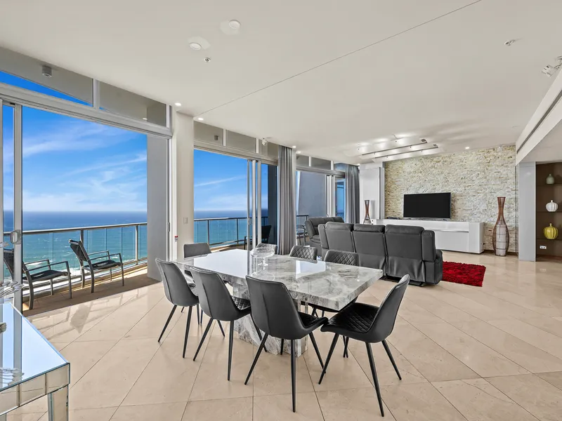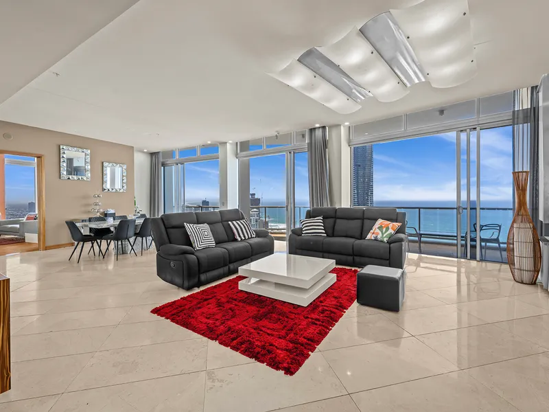 Elevated on the 47th floor of the iconic Chevron Renaissance towers, this sub-penthouse skyhome spans approximately 348m² of sophisticated living space. One of only two residences on its level, it combines refined design with a five-star resort lifestyle in the heart of Surfers Paradise. Floor-to-ceiling glass and lofty ceilings bathe the interiors in natural light, framing 270° views spanning the Pacific Ocean, city skyline and lush hinterland.
