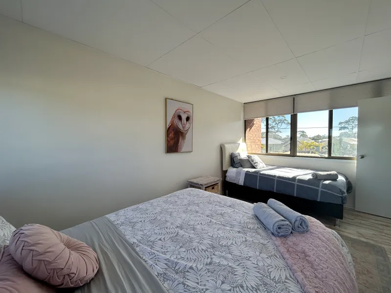 This one bedroom fully furnished apartment located on the second floor, features a coastal-inspired design, with one bedroom with a comfortable queen-size bed & additional single bed, an open-plan living area, a fully equipped kitchenette and a dining area. The bathroom is fitted with a shower and all the necessary amenities. The apartment is situated right in the heart of the town, giving you easy access to all the local delights. There is also a single, unallocated carspace at the rear of the complex.