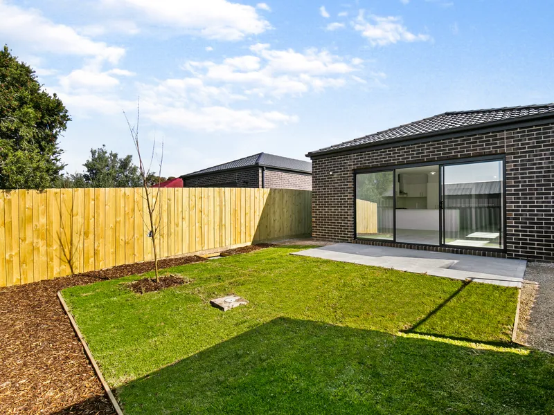 Sliding doors open from the living area to a private rear yard with established lawn, concrete entertaining area, and a lockable shed — perfect for secure storage. The front of the home is equally well presented with a neat lawn and landscaped garden beds.