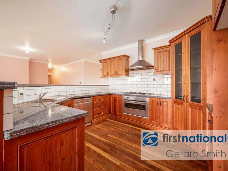 - Sunlit county-style timber and granite kitchen equipped with premium stainless steel appliances and natural gas cooking facilities