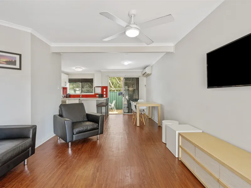 Air conditioned open-plan lounge/dining area with vinyl floor.