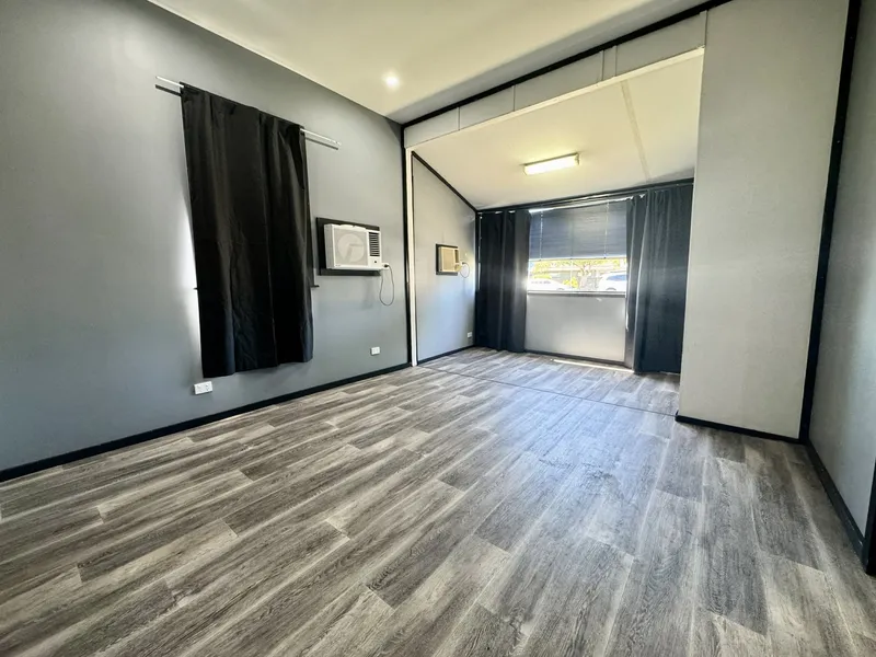 Featuring two well-sized bedrooms, a central bathroom, and a separate office space, the property provides flexibility for those working from home or needing extra room for study or storage. The home is air-conditioned to ensure comfort throughout the warmer months.