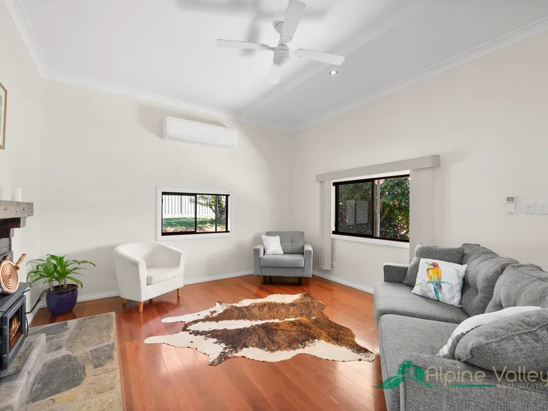 • Cozy loungeroom with wood fire and split system for year-round comfort