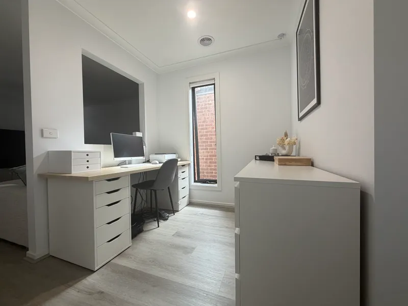 The home comprises three generous bedrooms, including a master bedroom with walk-in robe and ensuite. There is a front formal lounge along with a separate study area, providing plenty of space for both relaxation and working from home. The well-equipped, light-filled kitchen offers ample bench and cupboard space and overlooks the adjoining meals and family area, creating a comfortable space for everyday living.