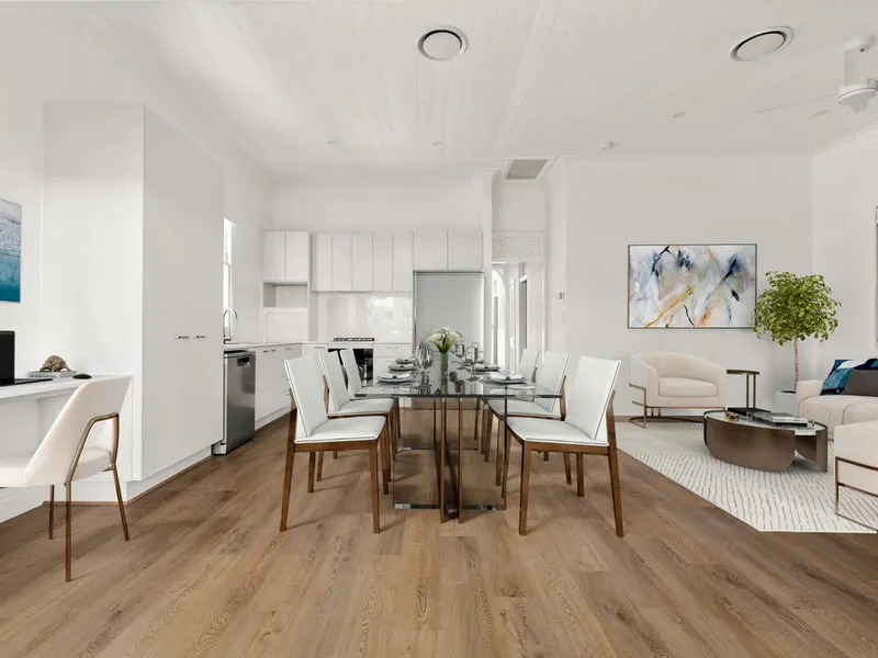 The open-plan kitchen, living, and dining area is filled with natural light, hybrid flooring, and ducted air-conditioning for year-round comfort. The oversized covered deck is perfect for alfresco dining or a morning coffee.