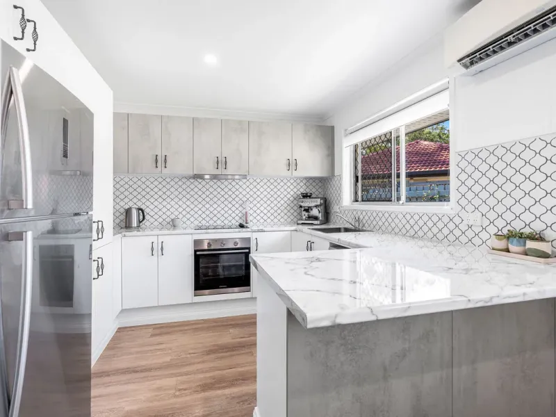 Upon entry, you are greeted with natural light throughout & a small study area. The modern brand-new kitchen accommodates large stone top bench & stainless steel appliances. It is the perfect kitchen to entertain & feed the little ones. The spacious living area with split system air conditioning is positioned with views of the alfresco area & fully fenced backyard.