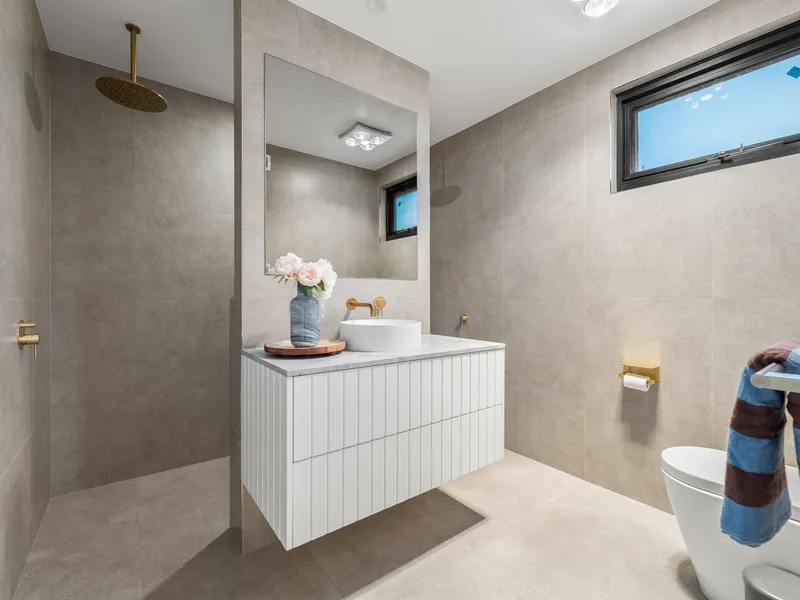 The generous master bedroom is complete with a walk-through wardrobe and a private ensuite. The two additional bedrooms are well sized and include built-in robes, offering flexibility for families or guests.