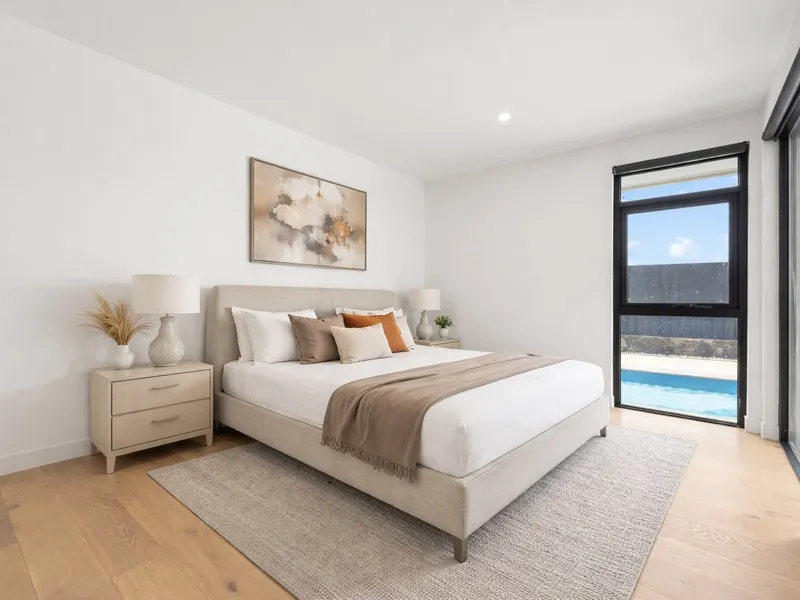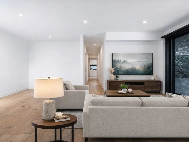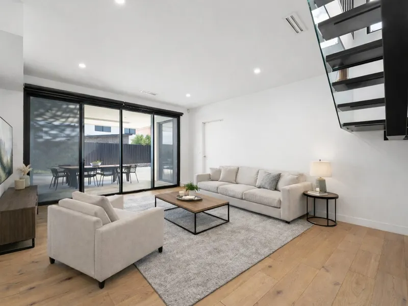 Step inside to a light-filled living area featuring warm timber flooring and generous proportions, allowing for comfortable lounge and media arrangements. Large sliding doors create a seamless connection to the rear courtyard, enhancing the sense of indoor–outdoor living.