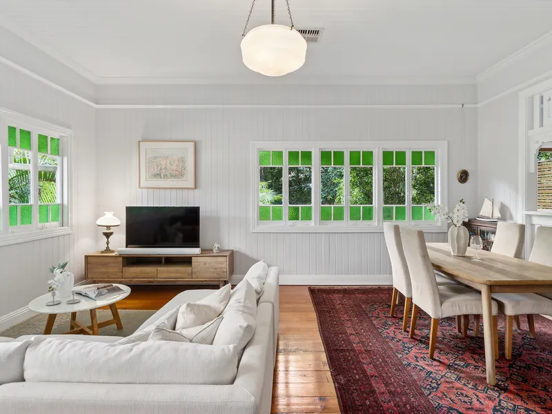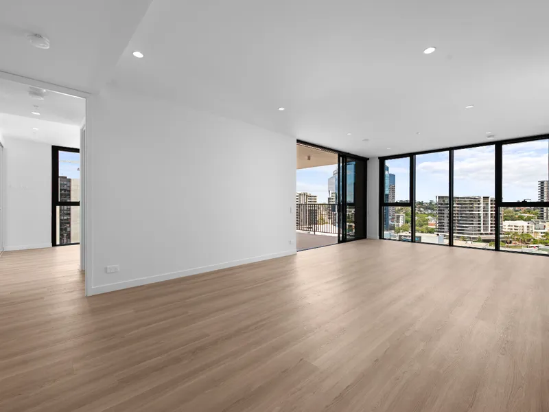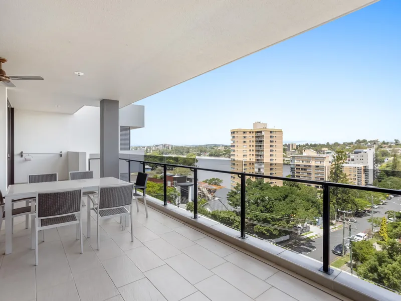 The light filled open plan living and dining area is framed by expansive floor to ceiling glazing, seamlessly extending onto a generous balcony that captures cooling breezes and a pleasant elevated outlook, including partial views across the Brisbane River. This inviting outdoor space creates the perfect setting for entertaining or quiet relaxation.