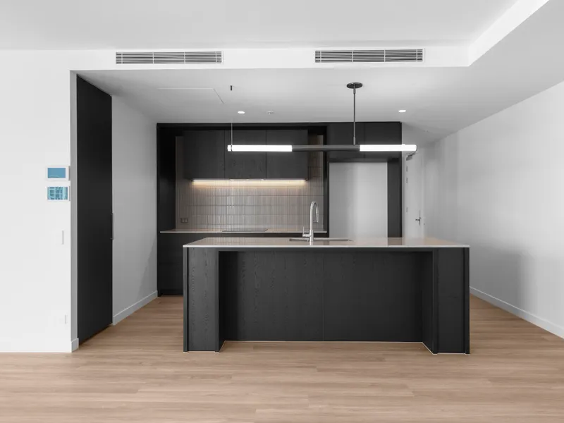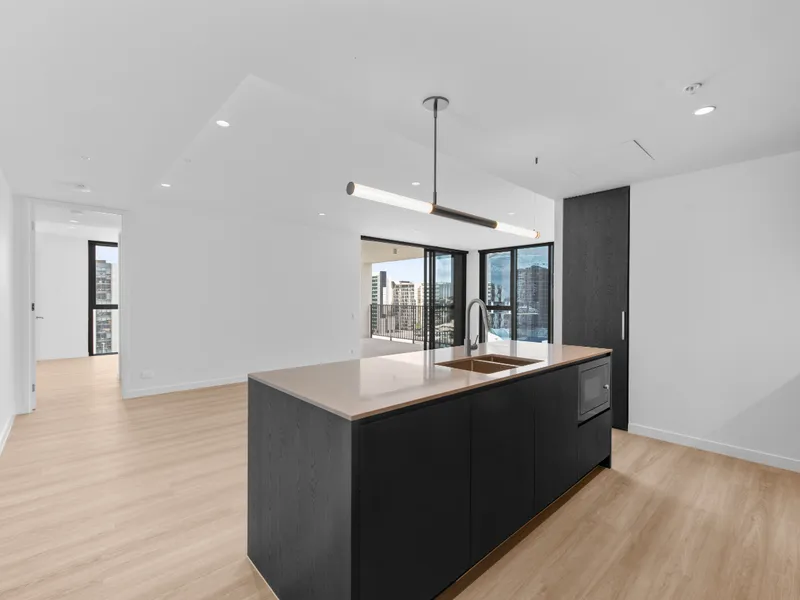 At the heart of the home, the sleek modern kitchen is equipped with quality appliances, stone benchtops and ample storage, combining functionality with sophisticated design. Timber flooring throughout the main living zones adds warmth and timeless appeal. The apartment is offered fully furnished with quality furniture, allowing for an effortless move-in and immediate enjoyment.
