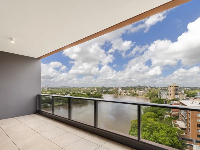 walk-in robe, two designer bathrooms with premium finishes, and secure parking for two vehicles plus a storage cage. The expansive open-plan living and dining area flows seamlessly to your private balcony, offering an ideal space for relaxation and entertainment with stunning river vistas.