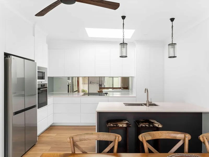 [:] Gourmet kitchen with stone benchtops, electric cooking, dishwasher and curated cookware.