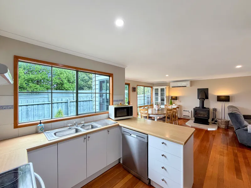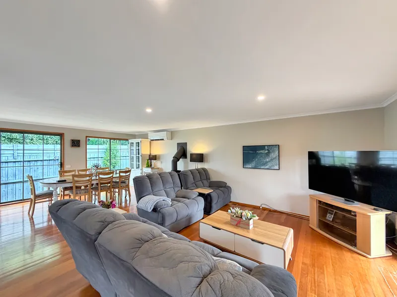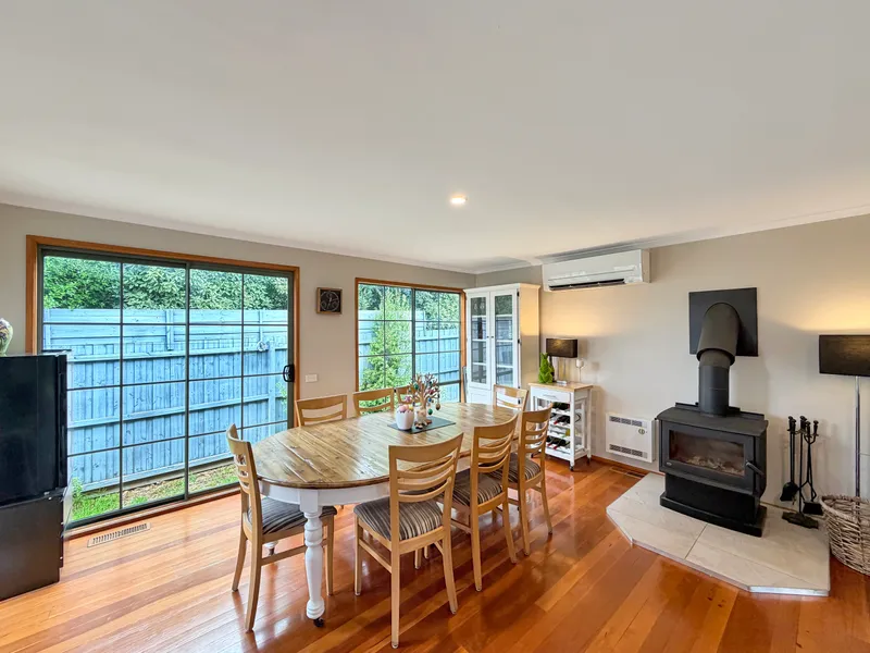Located on the ground floor, the spacious living room provides a welcoming place to relax and unwind. The room is generous in size and features a split system for year-round comfort along with a wood fire heater, perfect for creating a warm and cosy atmosphere during the cooler months.