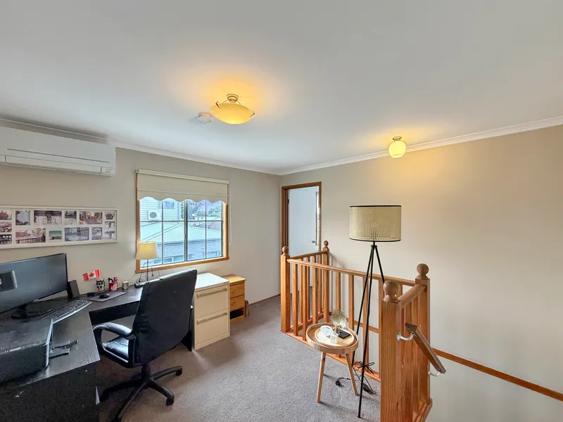 At the top of the stairs, a study nook is positioned on the landing, creating the perfect space for those working from home or needing a quiet area for study. A split system unit ensures comfort while working year-round.