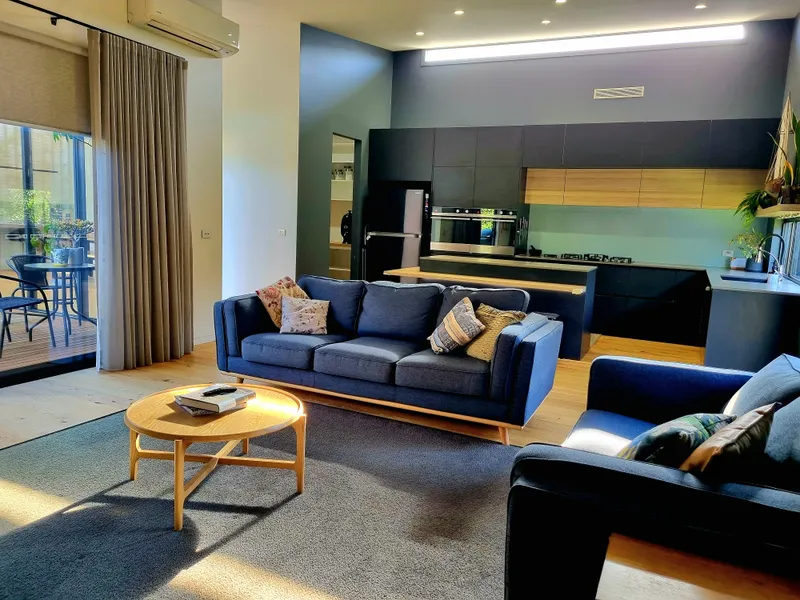 The heart of the home is the light-filled kitchen, thoughtfully designed with both style and functionality in mind. Large windows flood the space with natural light, highlighting the quality finishes including a striking island bench, tiled splashback, 900mm cooktop and dual electric ovens, and a spacious pantry. Overlooking the main living and dining zones, the kitchen allows for easy everyday living and entertaining.