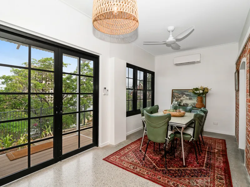 Renovated interiors featuring exposed brick, polished concrete floors, and curated décor