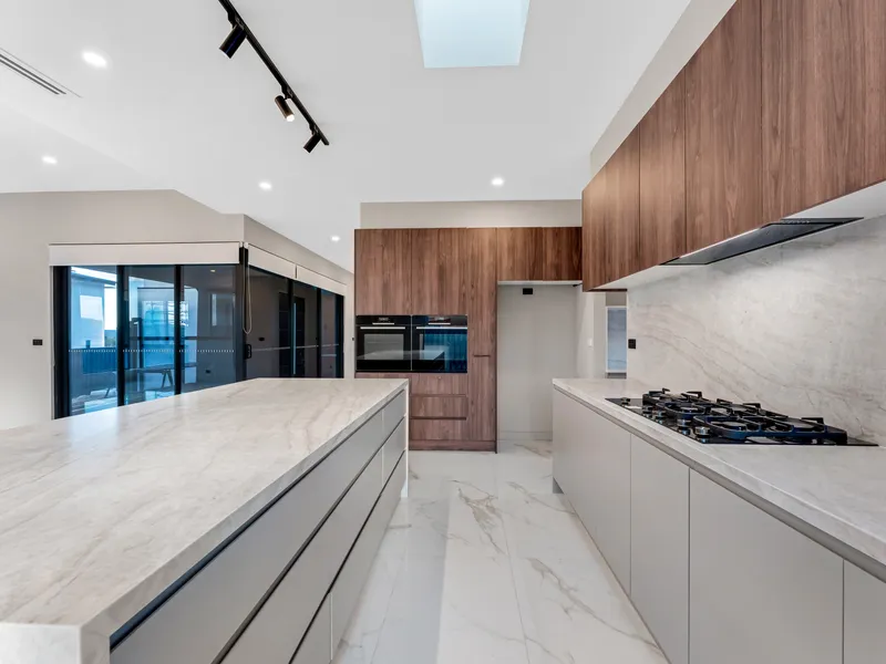 - Modern kitchen featuring stone benchtops, premium appliances, and ample storage