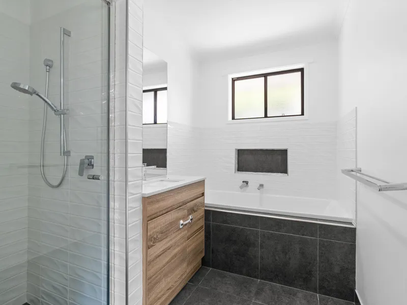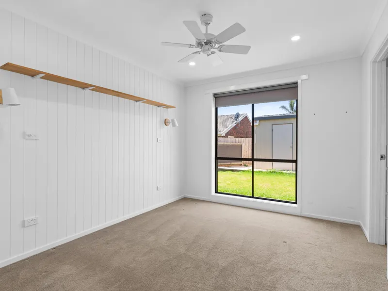 Modern flooring throughout enhances the fresh, contemporary feel of the home, while a new split-system air conditioning unit ensures year-round comfort. All bedrooms are well-sized, fitted with ceiling fans, and the overall layout provides flexibility and functionality for a variety of living arrangements.