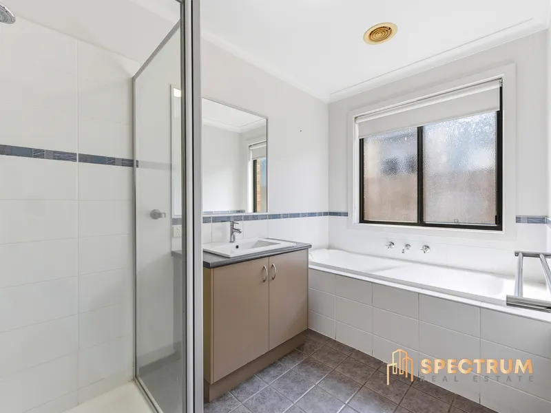 The spacious master bedroom includes a walk-in robe and private ensuite, while the main bathroom offers both a separate bath and shower for added convenience.