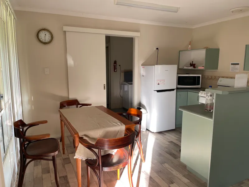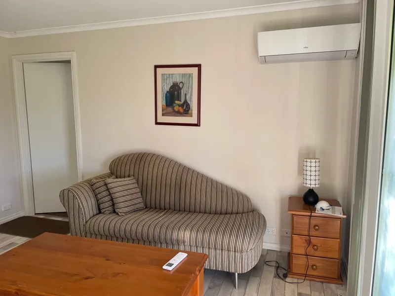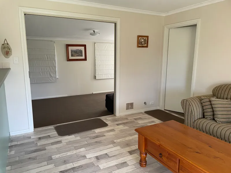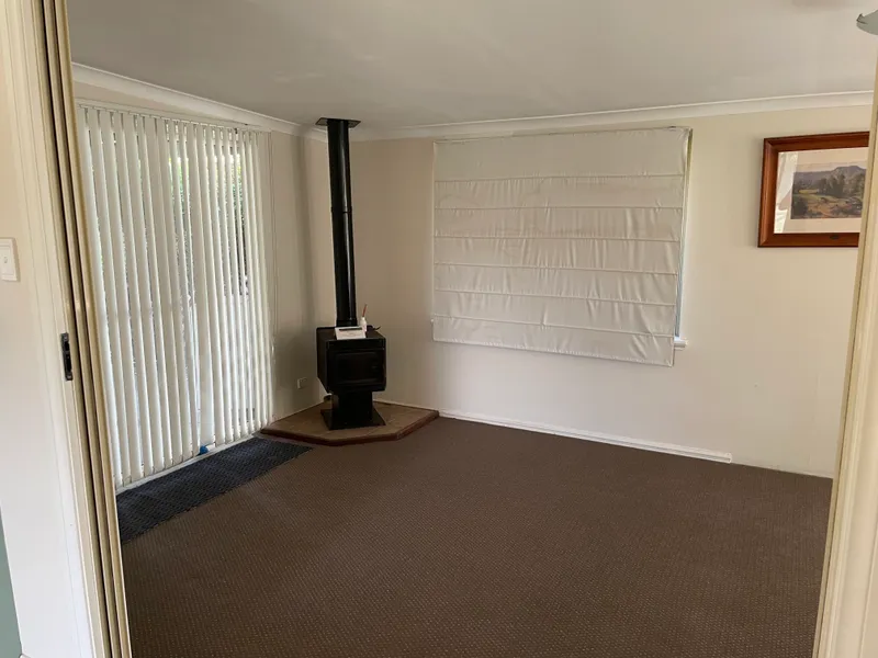 Inside, the home offers year-round comfort with reverse cycle air conditioning and a cosy wood fire heater. The spacious bedrooms provide ample room to relax, while the well-equipped kitchen features a gas cooktop and oven, refrigerator, and microwave for your convenience. A garden shed is also available for tenant use.