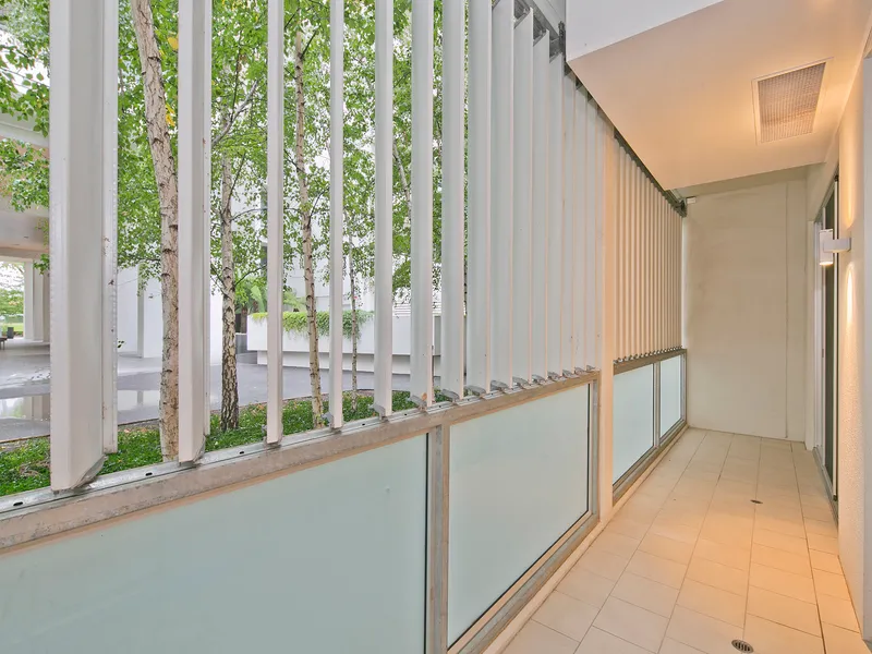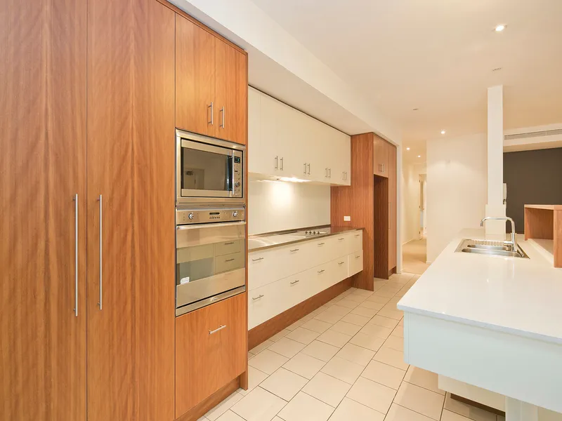 The living area seamlessly opens to a large patio, perfect for entertaining guests. Additional amenities include two restricted-access car spaces with lockable storage for added convenience.