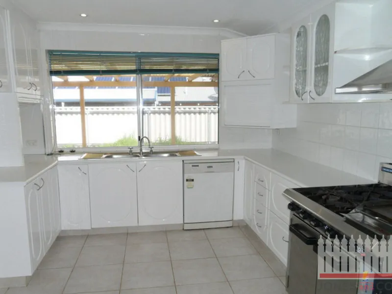 Inside, the home features a spacious open-plan kitchen, living, and dining area designed for comfortable family living. The large kitchen is well-equipped with gas cooking appliances, a dishwasher, and ample bench and storage space, making meal preparation a breeze.