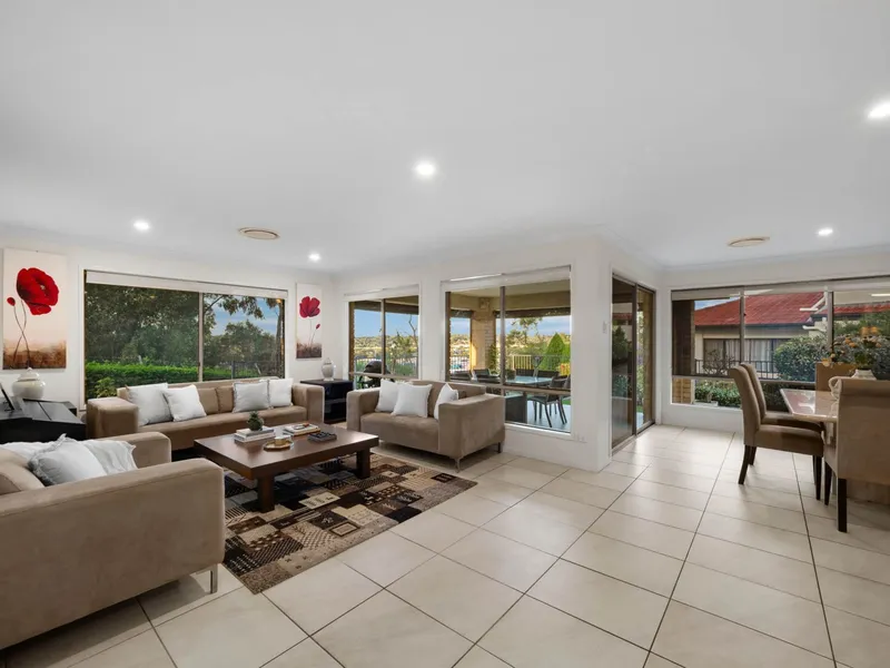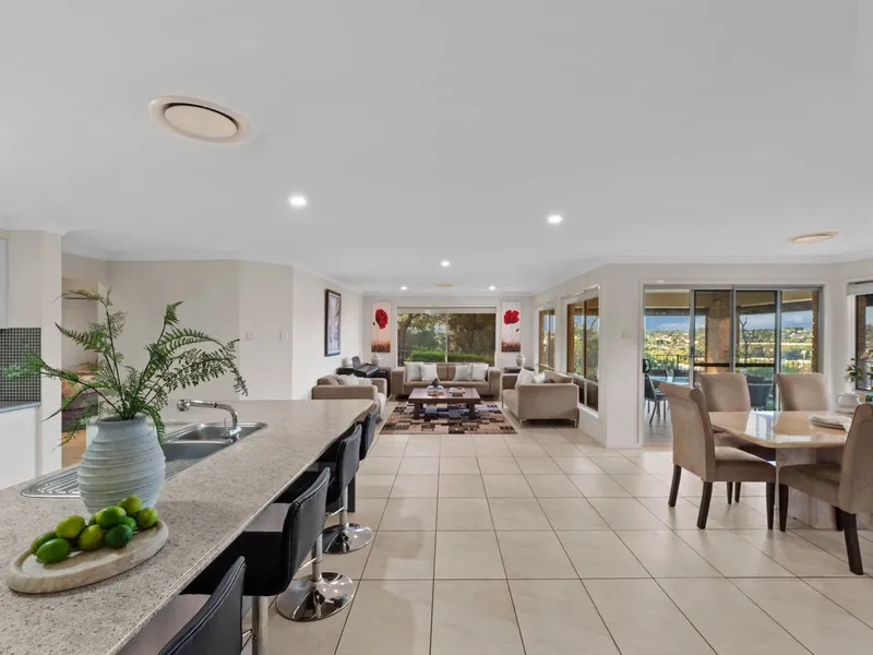A wide and welcoming entrance leads to a separate formal lounge - perfect as a quiet retreat or media room. The heart of the home is the open-plan kitchen, dining and family area, all positioned to capture the stunning outlook. The kitchen overlooks the living zone and outdoor entertaining space, allowing you to stay connected while preparing meals.