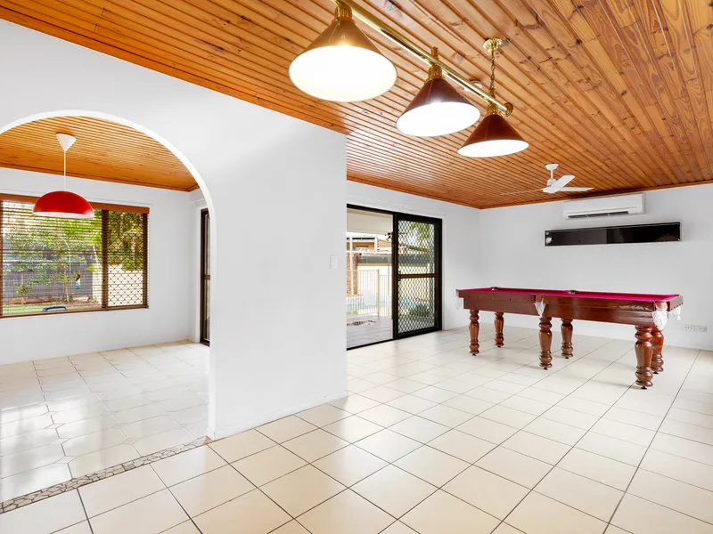 • Three separate living areas include a formal lounge and dining area, a meals area