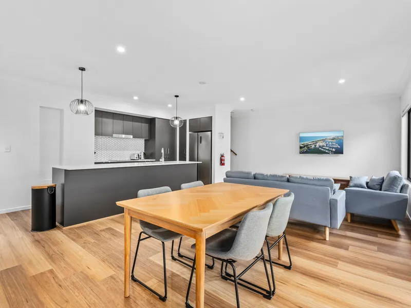 • Sleek Kitchen: Modern kitchen equipped with stone bench tops, stainless steel fridge, and electric cooking
