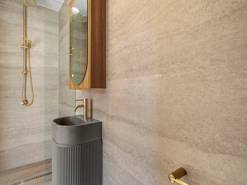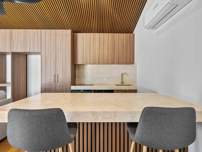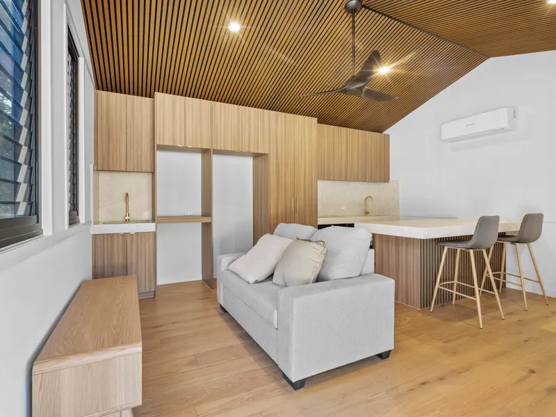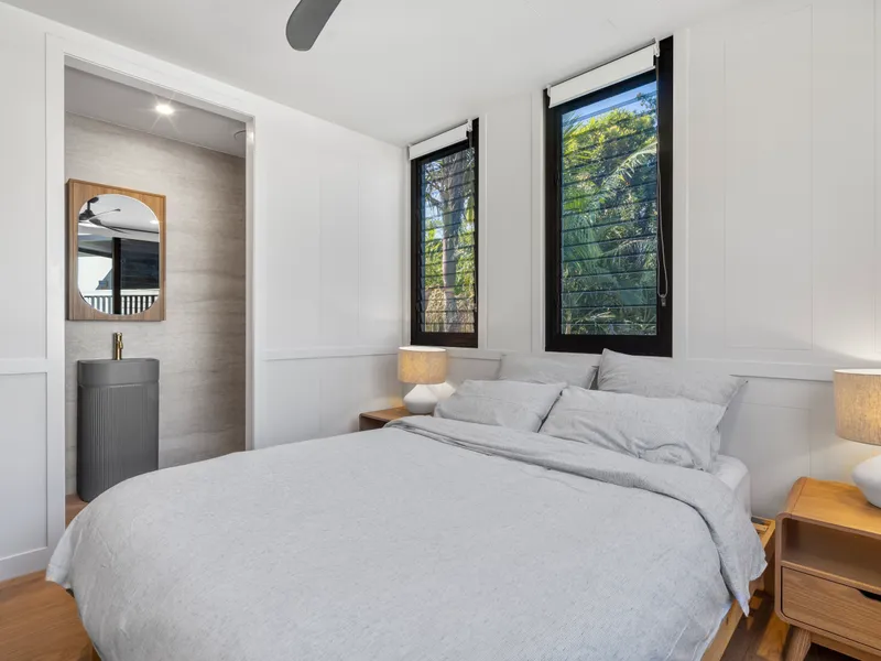 Each bedroom boasts its own private ensuite, and the open-plan layout is complemented by premium finishes including natural stone benchtops, oak timber flooring, and elegant fixtures from ABI Interiors.