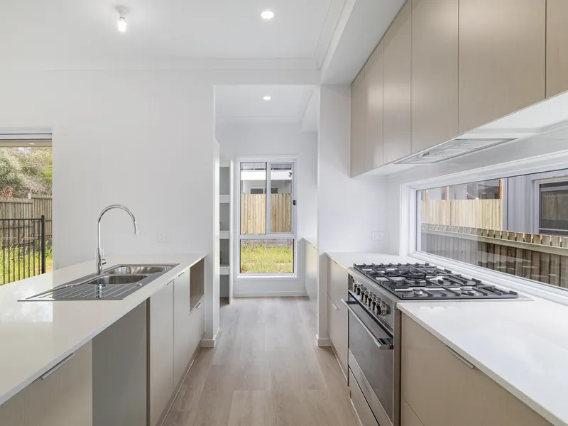 • Modern kitchen with a full suite of stainless steel appliances including a dishwasher, 900mm gas cooktop, oven and rangehood