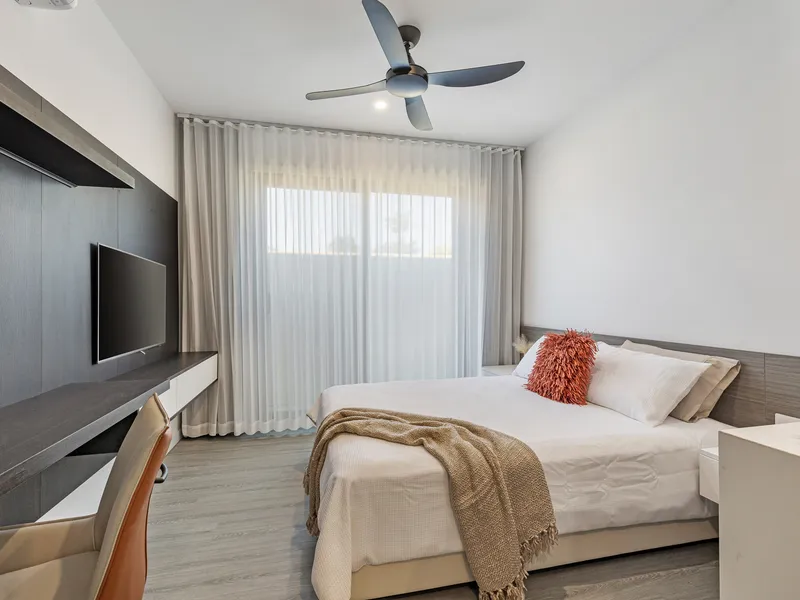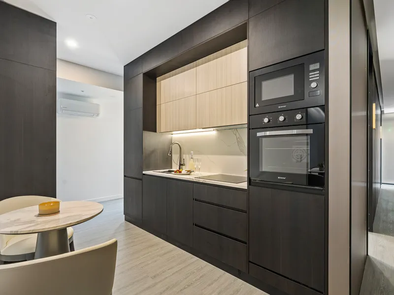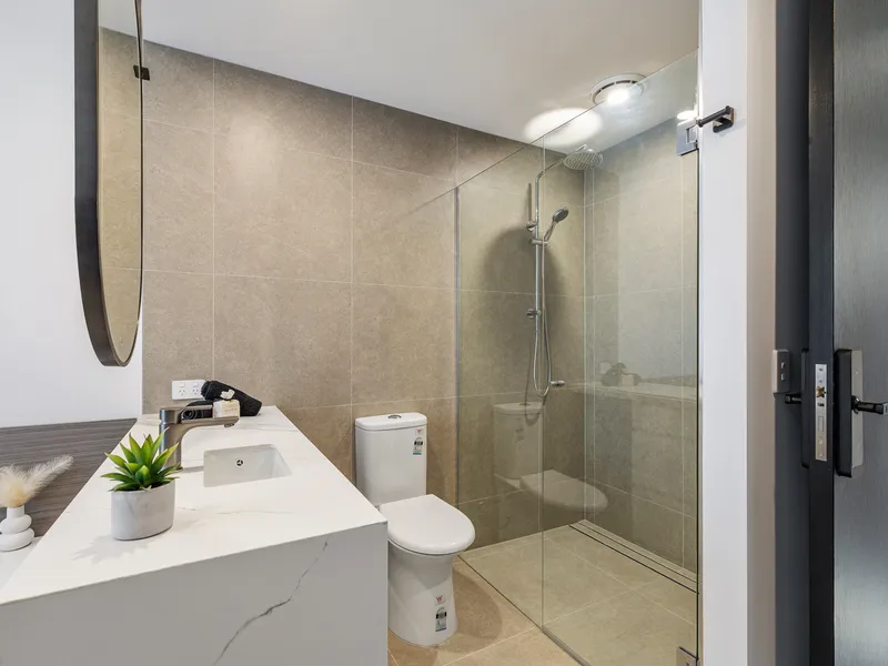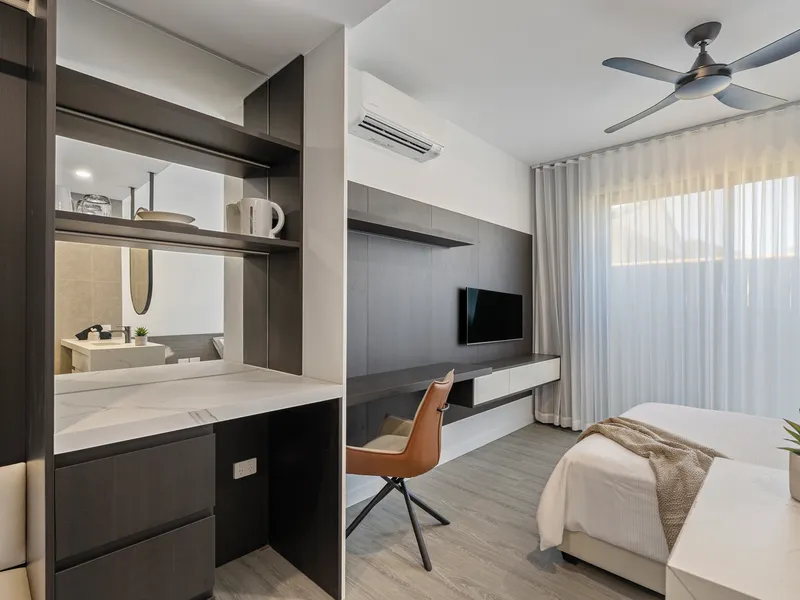 Shared main living zone zone with quiet private lounge area. Modern open plan kitchen, plenty of preparation space and electric cooking. Providing in-house laundry facilities and the home fully equipped with advanced security systems, digital access control and CCTV to all the common areas of the property to keep you safe.