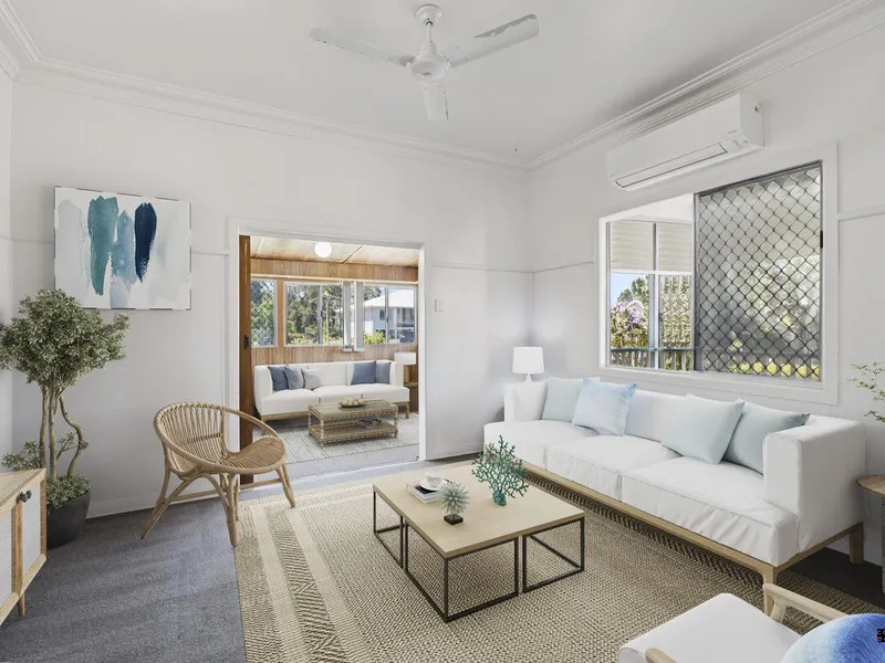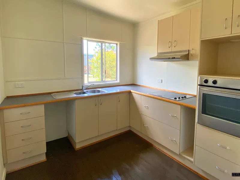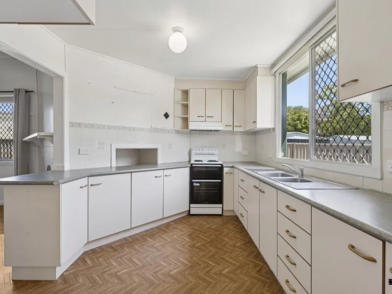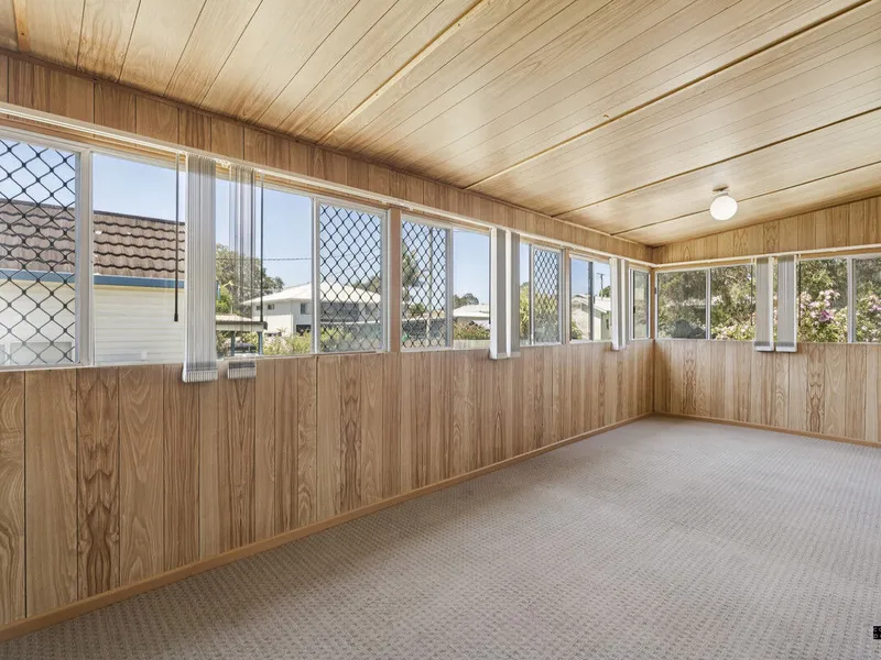 Inside, the property features high ceilings, a functional kitchen with electric cooking, a light-filled sunroom, and the added comfort of ceiling fans and air-conditioning throughout.
