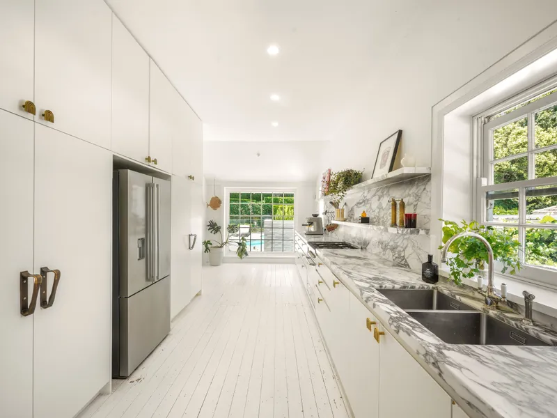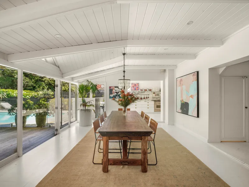Featuring light-filled interiors and multiple living zones, the home opens to a landscaped split-level backyard with manicured lawn, swimming pool and cabana, perfect for entertaining.