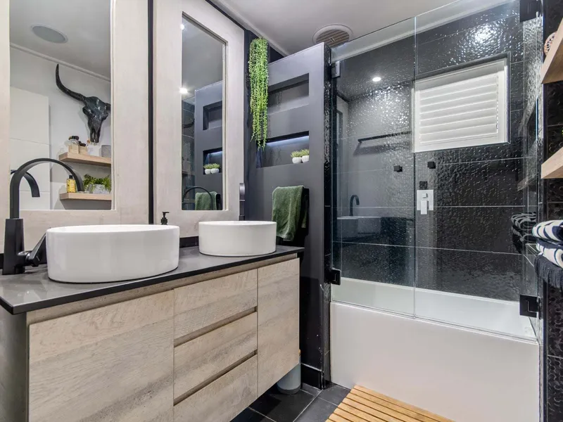 • Modern and beautifully presented bathroom with quality finishes. It features a dual vanity and a bath and shower combo.