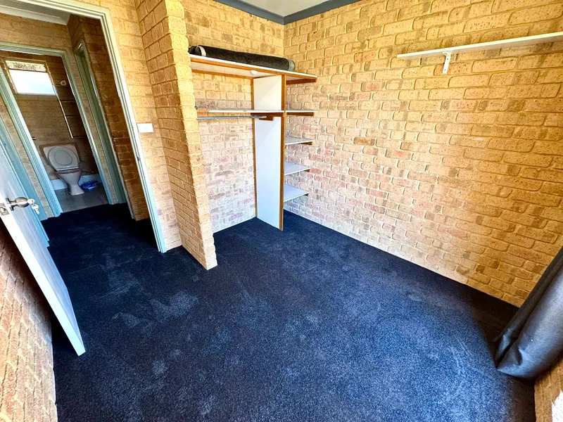 The bedrooms are well-sized and include built-in shelving and storage, while the exposed brick throughout adds a sense of warmth and durability. A ceiling fan in the bedroom provides added comfort.