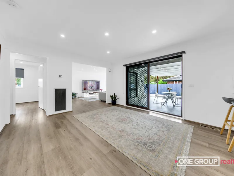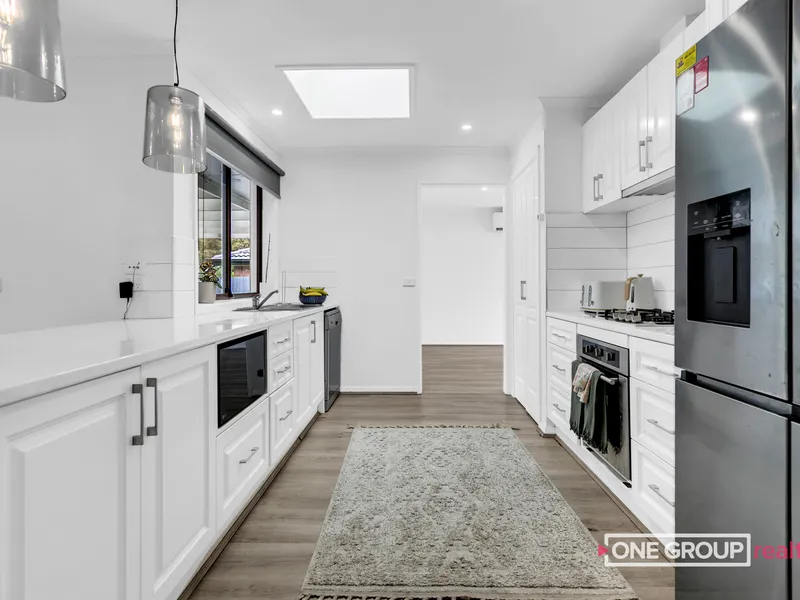 Inside, the home features a light-filled open-plan kitchen, living and dining area designed for everyday comfort and easy living. The modern kitchen includes stone benchtops, stainless steel appliances and a dishwasher, making it both stylish and functional.