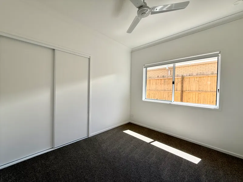 The sleek, contemporary kitchen is equipped with plenty of storage and a dishwasher, flowing seamlessly into an open-plan living and dining area - perfect for everyday living and entertaining. Boasting tiled floors throughout the living areas and cozy carpeted bedrooms, complemented by ceiling fans in every room to keep you comfortable year-round.