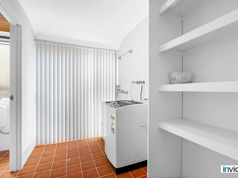 - Functional laundry with open shelving, compactable washing line and rear yard access