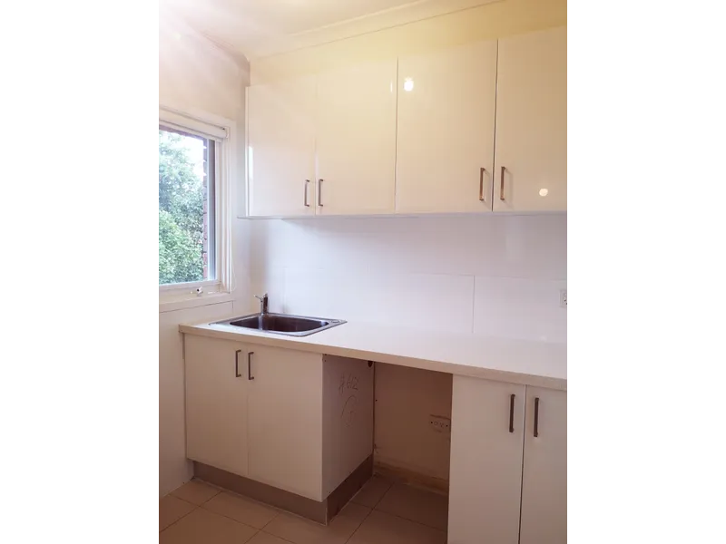 Spacious and light-filled, the home boasts an L-shaped living and dining area that flows seamlessly into a stylish galley kitchen. Featuring stone benchtops and stainless steel gas appliances, the kitchen combines functionality with contemporary elegance.