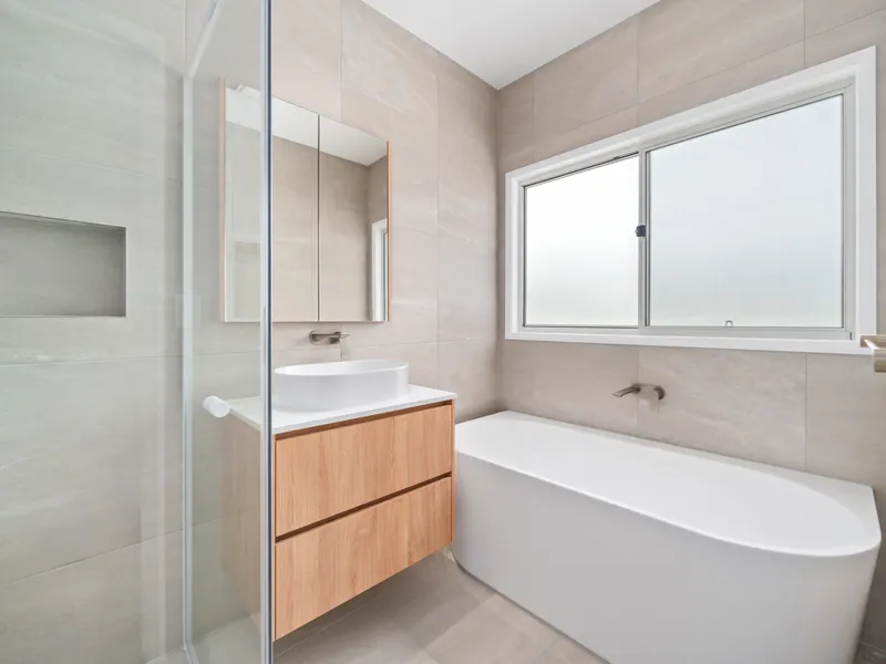 The interior showcases floorboards throughout the main living areas, creating a modern and low-maintenance space. The kitchen is thoughtfully designed with an island top and ample storage, making it ideal for everyday cooking and entertaining. The home includes a study nook, internal laundry, and well-sized bedrooms with carpeted floors and ceiling fans, while the master bedroom is complemented by an ensuite and walk-in robe. Additional features such as a bathtub and ceiling fans in the living area enhance overall comfort.