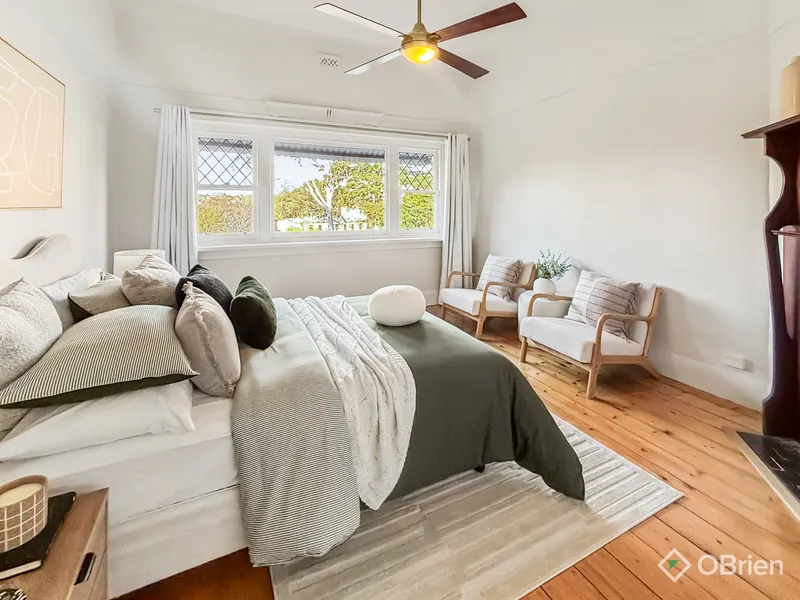- Second large bedroom features ceiling fan, decorative fireplace, stunning lead lighting in the windows
