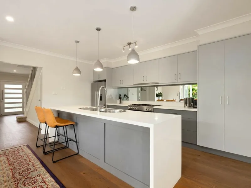 * Modern gas kitchen with stainless steel appliances and an island bench