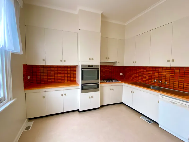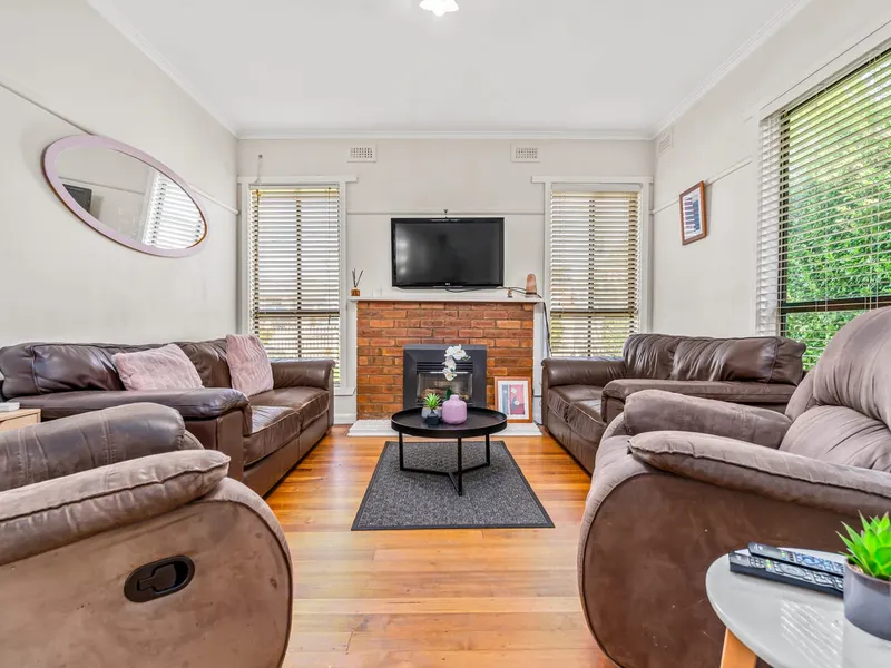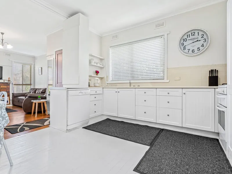 The home features three spacious bedrooms, each with built-in robes, providing plenty of storage space. The separate living room is generously sized and offers both an electric heater and a split system, ensuring comfort all year round. The kitchen, with its retro vibe, is expansive in size and comes equipped with a gas cooktop and an electric wall oven, making it perfect for both cooking and entertaining.