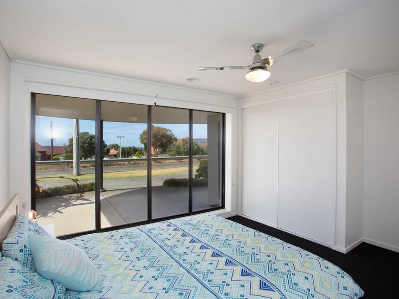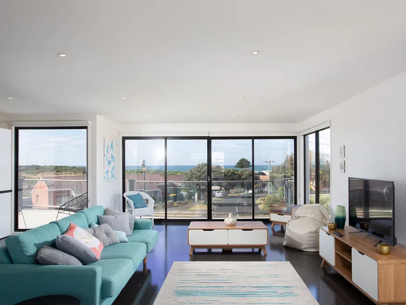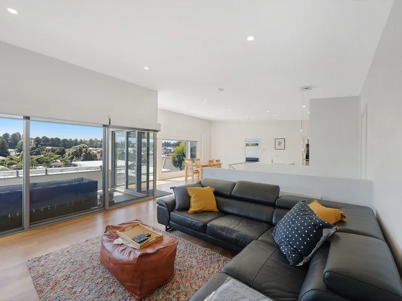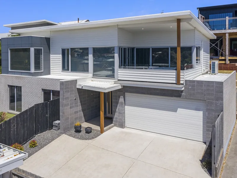 Upstairs there is a very spacious living area with expansive glass windows framing glorious views over Lady Bay. This room has glass sliding doors opening onto generous sized balconies, a kitchenette complete with sink, bar fridge and granite bench tops.