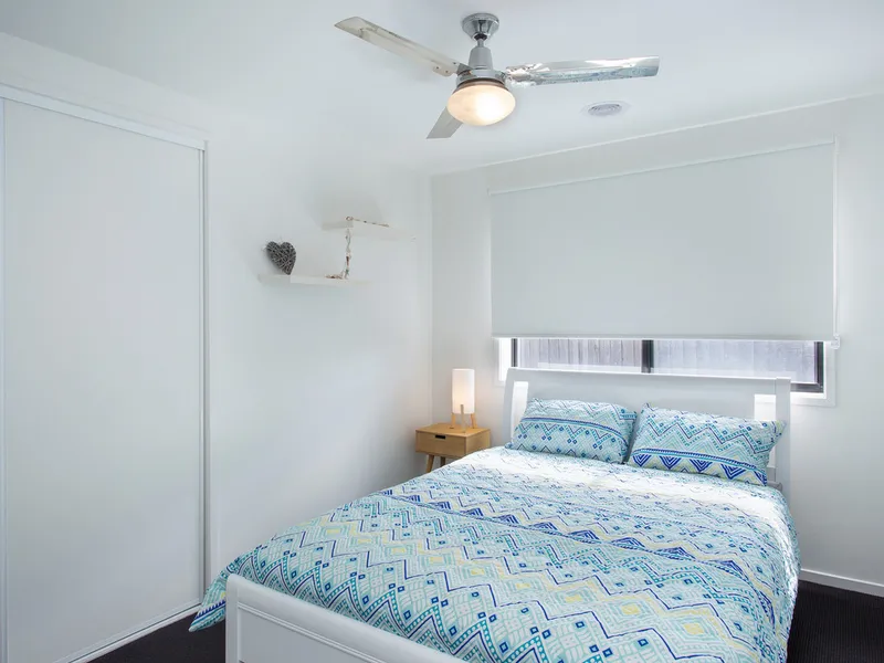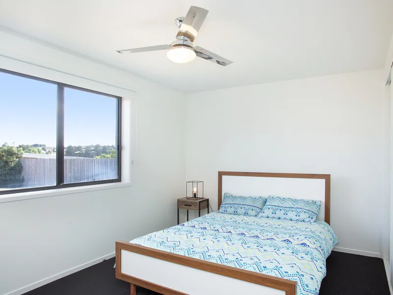The master bedroom has walk in robes and an ensuite bathroom with shower, modesty wall to the separate toilet and vanity with glass sliders wall framing ocean views where it flows to the balcony.