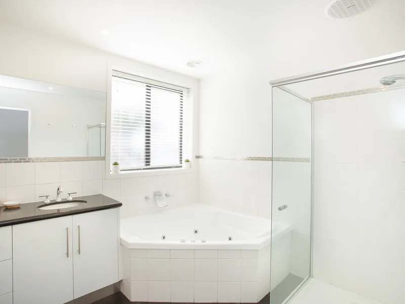 Downstairs comprises of an expansive open plan kitchen with lovely polished floorboards, granite benchtops and stainless steel appliances including 2 drawer dishwasher, electric oven and gas cooktop. The separate dining room, opens off the kitchen, with north facing windows and sliding glass doors which open onto the rear courtyard and BBQ area. The 3 good sized bedrooms, each each have BIR's and ceiling fans, and the family bathroom boasts a corner spa bath and a separate toilet room.