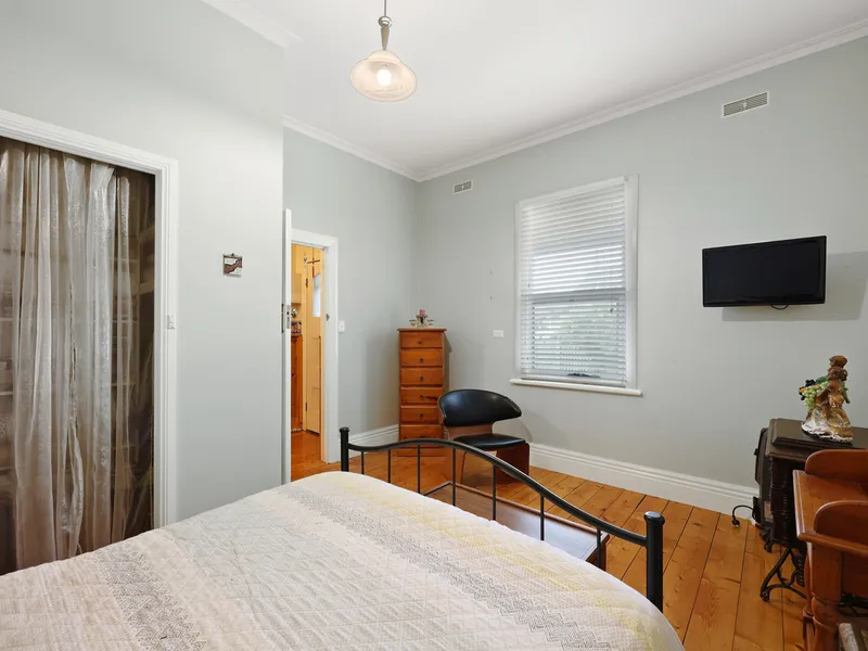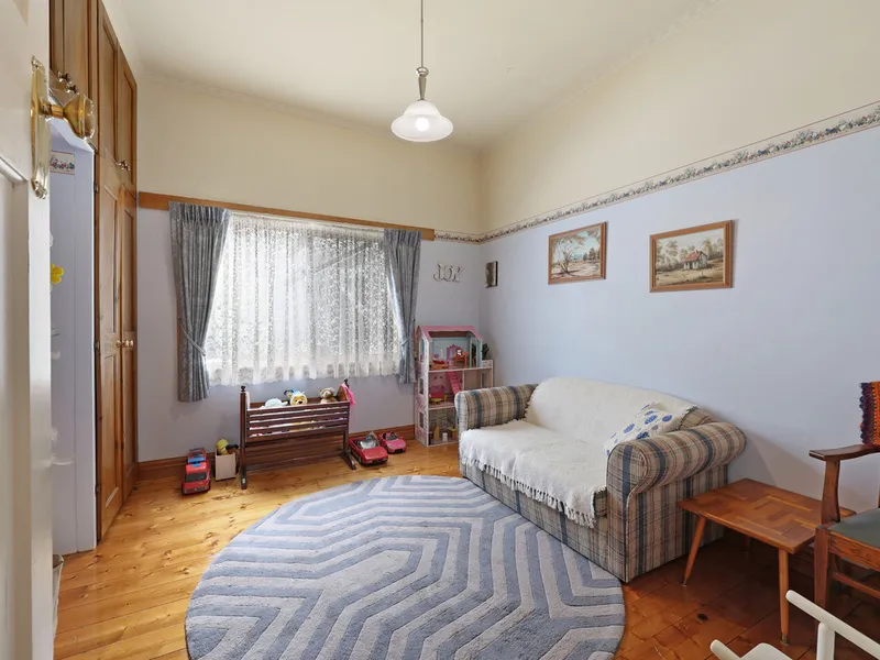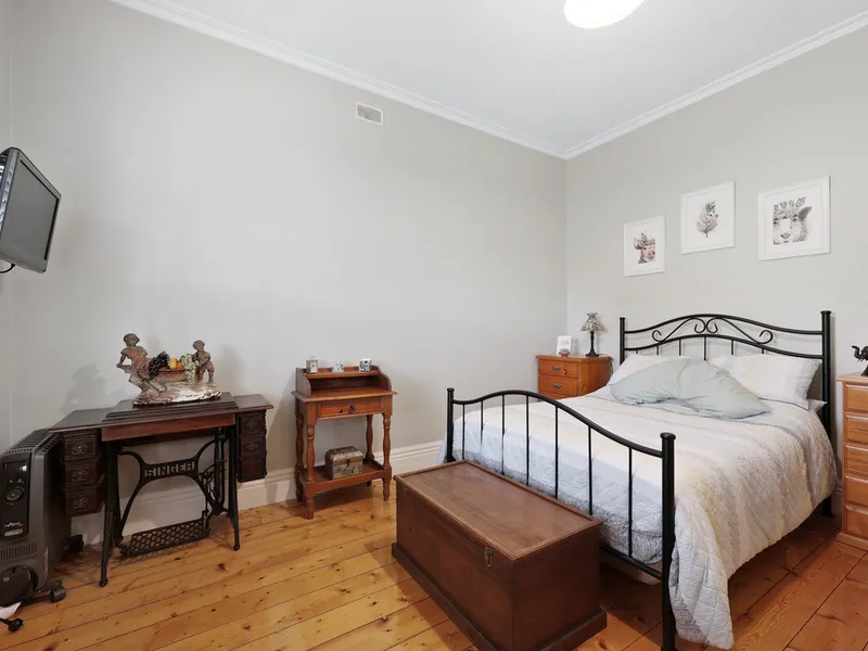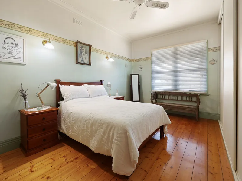 Featuring high ceilings and original polished pine floorboards, there are two large front bedrooms with ample closet space plus two good sized bedrooms, both with built in wardrobes. The central kitchen has been tastefully renovated with crisp cabinetry, updated appliances, large walk in pantry and plenty of cupboard & drawer space. The living room is a lovely light-filled room with gas log fire and glass sliding doors leading to the front yard. The main family bathroom has a shower and bathtub, plus two separate toilets and a separate laundry.